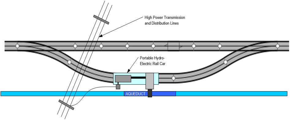 With the use of natural gas to power the pumping stations, the pressure and volume of water within the pipe network provides the energy source for hydro-electric generation. Re-purposing existing wind generators which provide 1, 2.5, and 5 megawatts of electric power, depending upon the diameter and flow in 4, 6 and 8 foot diameter pipes, would be used to inject electrical energy into the national power grid. These portable hydro-electric rail cars would be managed and serviced by the applicable railroad organization that deploys them on their rail lines.